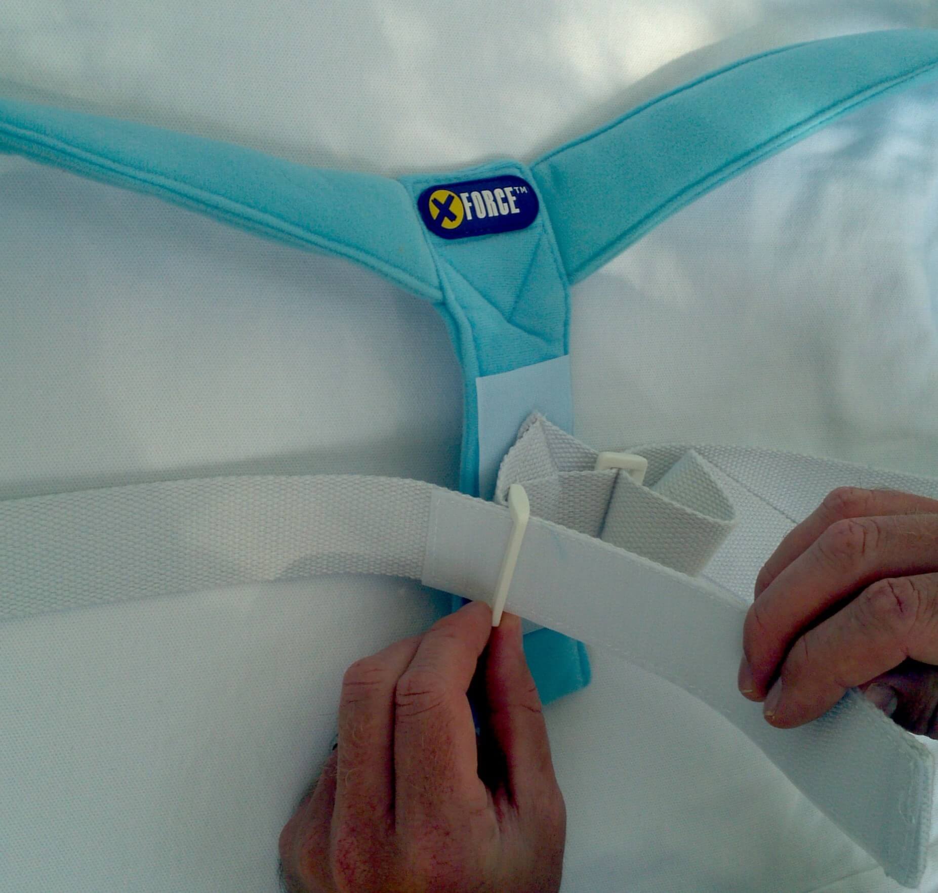 - Put the support on just as you would a backpack. Start by feeding one arm through the tension strap and then feed the other through. Remember, the “Xforce” seal should be facing out when worn properly.
